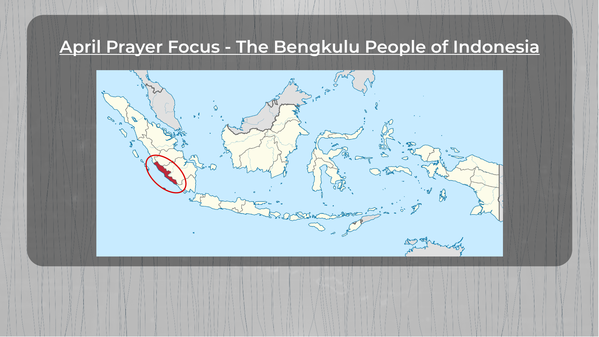 Throughout April, we want to intentionally focus our prayers to the Bengkulu people on Sundays and in our small groups. This is 1 of 10 potential unreached people groups that our missionaries could eventually engage in Indonesia! Start your group off by praying together for this people group! Below is some information on the Bengkulu and prayer prompts.